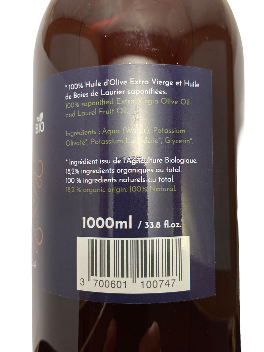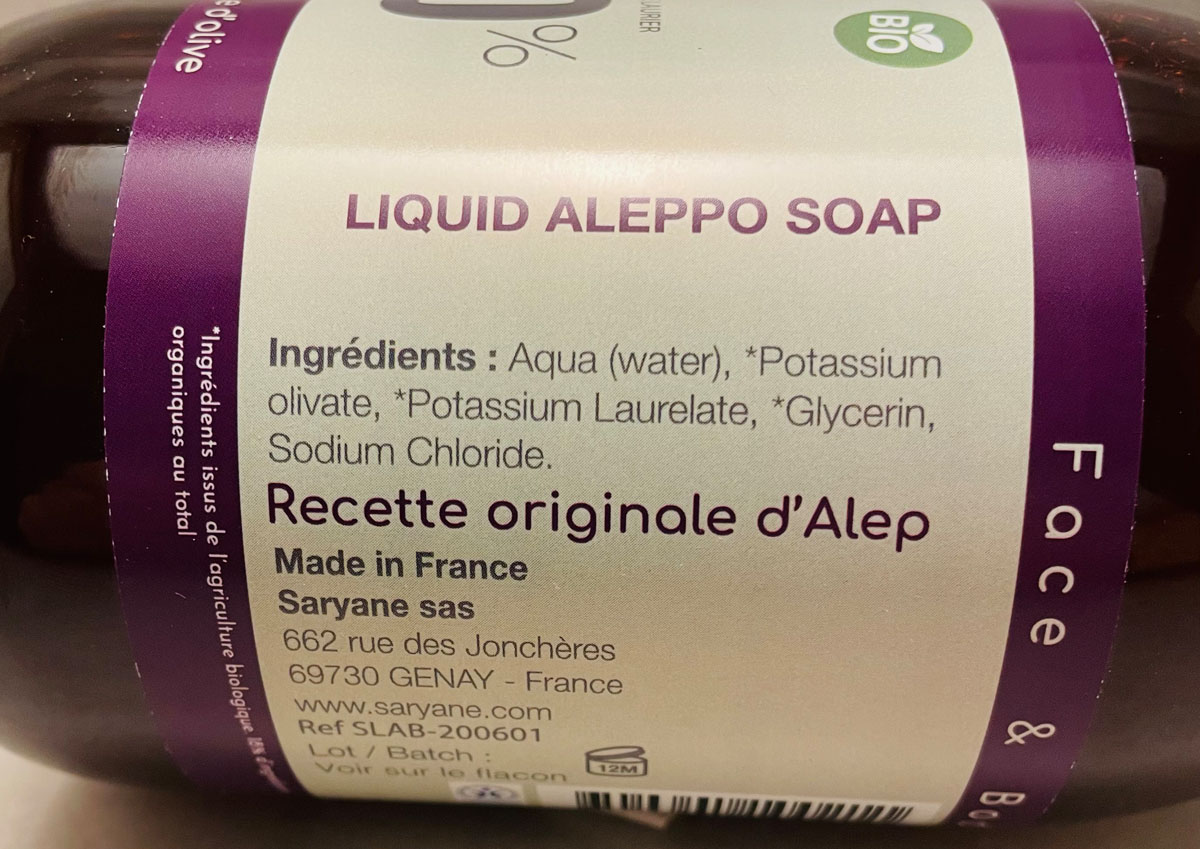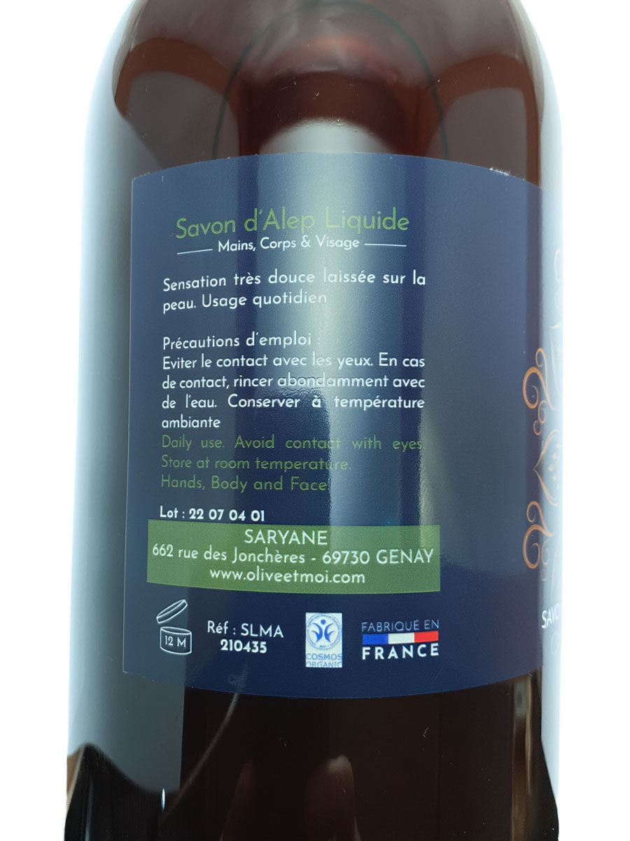 En effet notre savonnier fabrique ce savon liquide avec les mêmes ingrédients que le véritable savon d’Alep en pain: de l’huile d’olive, de l’huile de baie de laurier, de la soude et de l’eau !