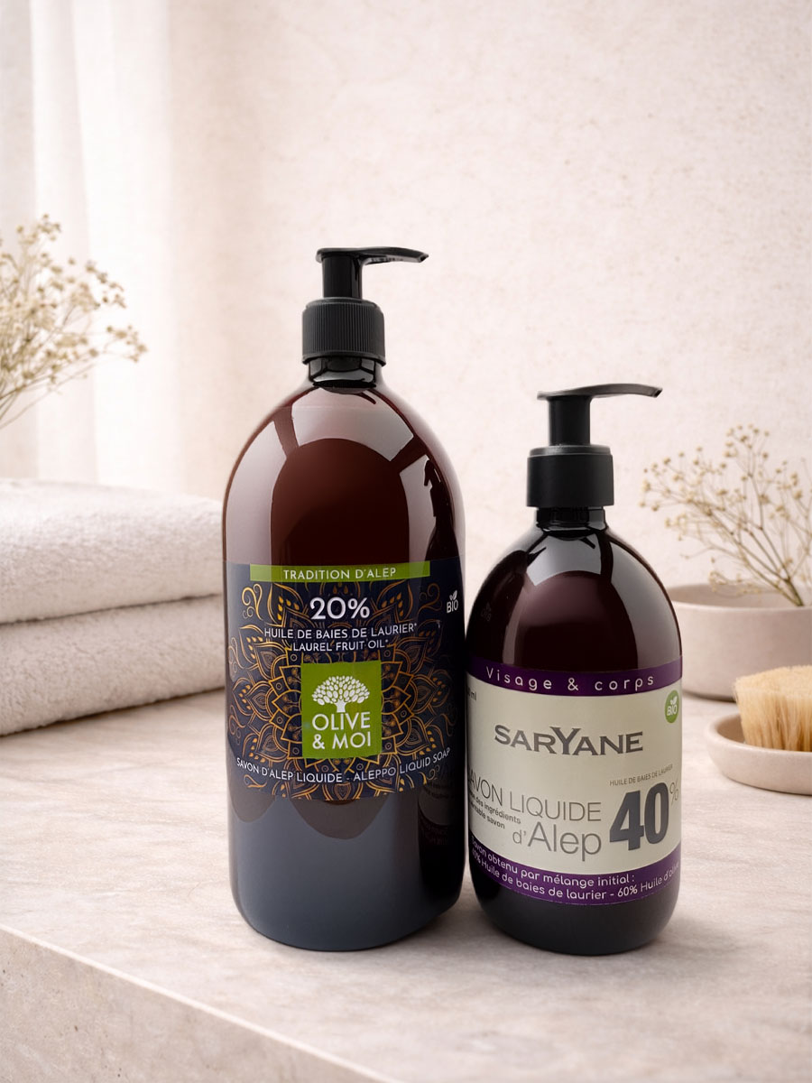 Utilisez plutôt le savon d’Alep liquide à 20% d’huile de baie de laurier pour un usage quotidien. Et privilégiez le savon d’Alep liquide à 40% d’huile de bais de laurier pour les « crises dermatologiques »: peaux grasses, acné, pellicules, démangeaisons, …