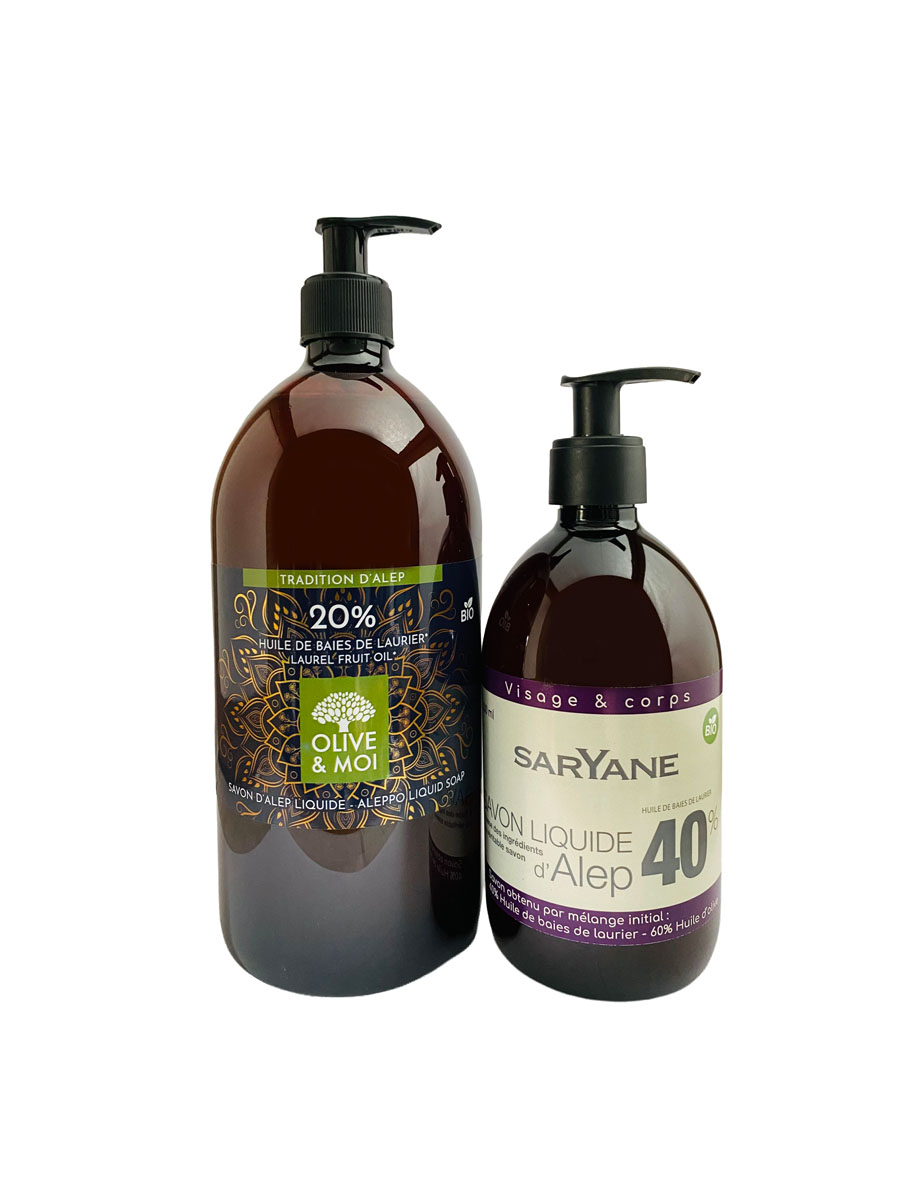 Bouteille à pompe de 500ml de savon d’Alep liquide à 40% d’huile de baie de laurier et sa bouteille à pompe d’1l de savon d’Alep liquide à 20% d’huile de baie de laurier .